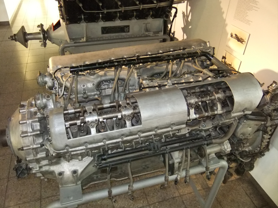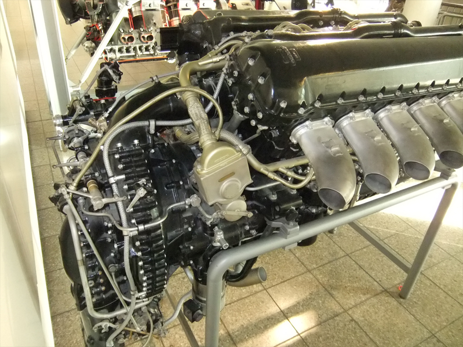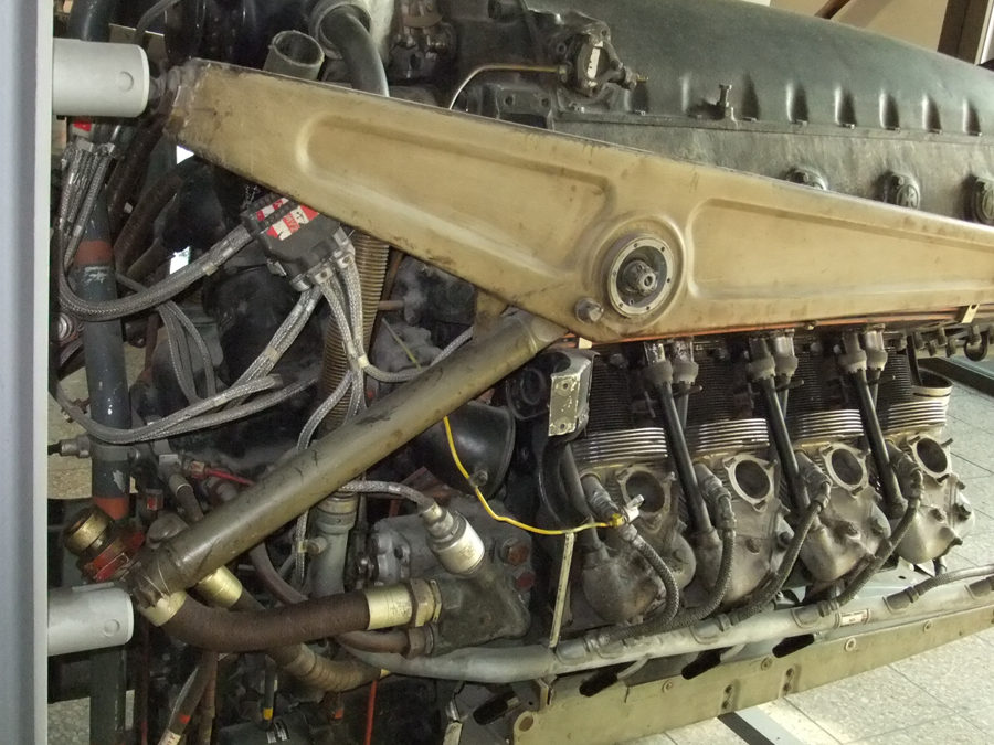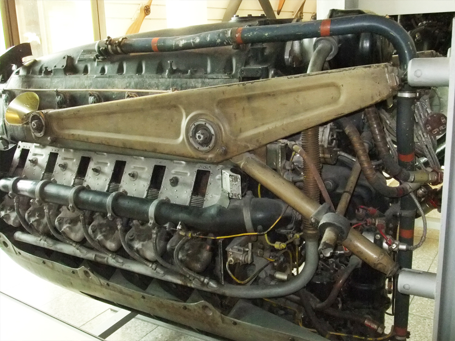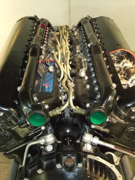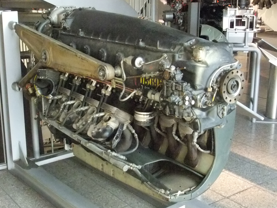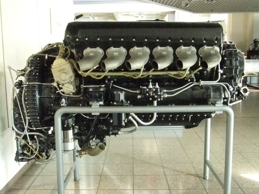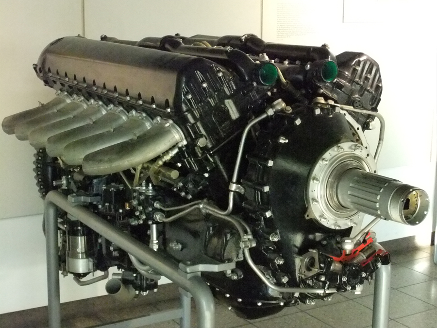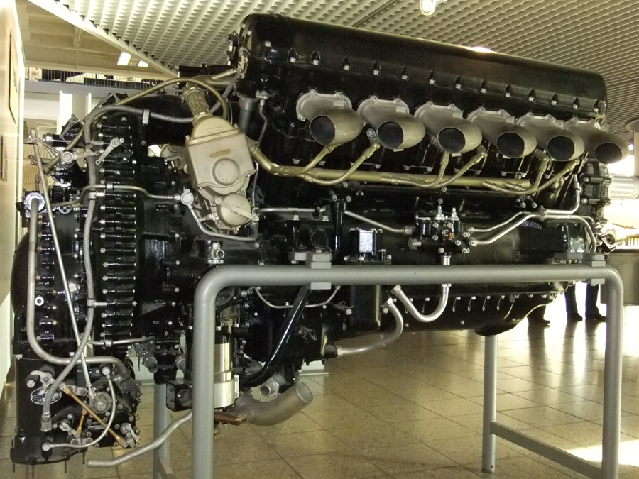 12-Zylinder Flugmotor. Der Flüssigkeitsgekühlte Motor arbeitet im Viertakt mit Einspritzpumpe.