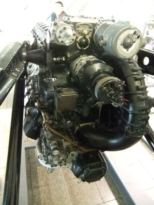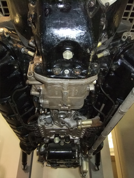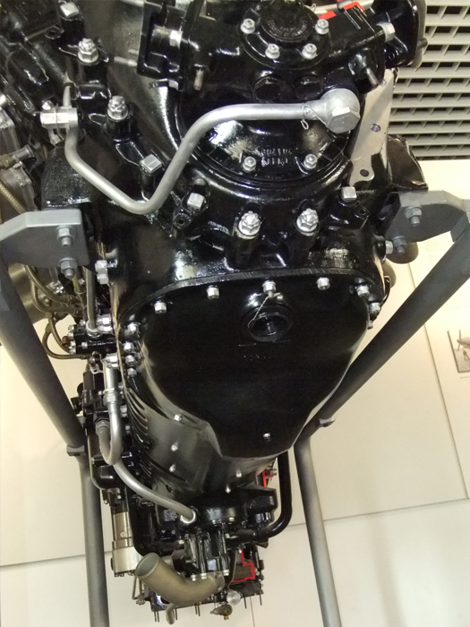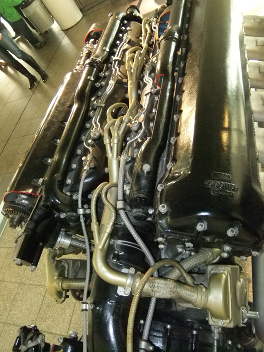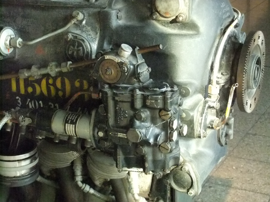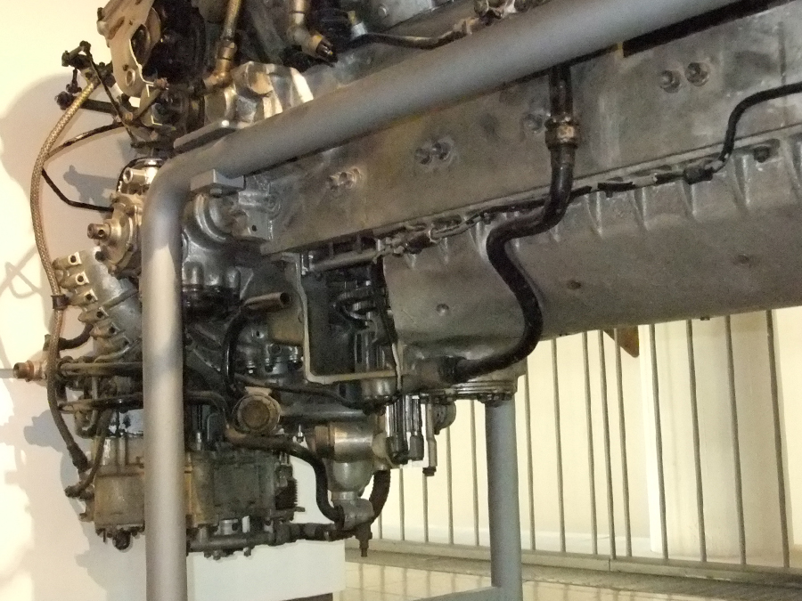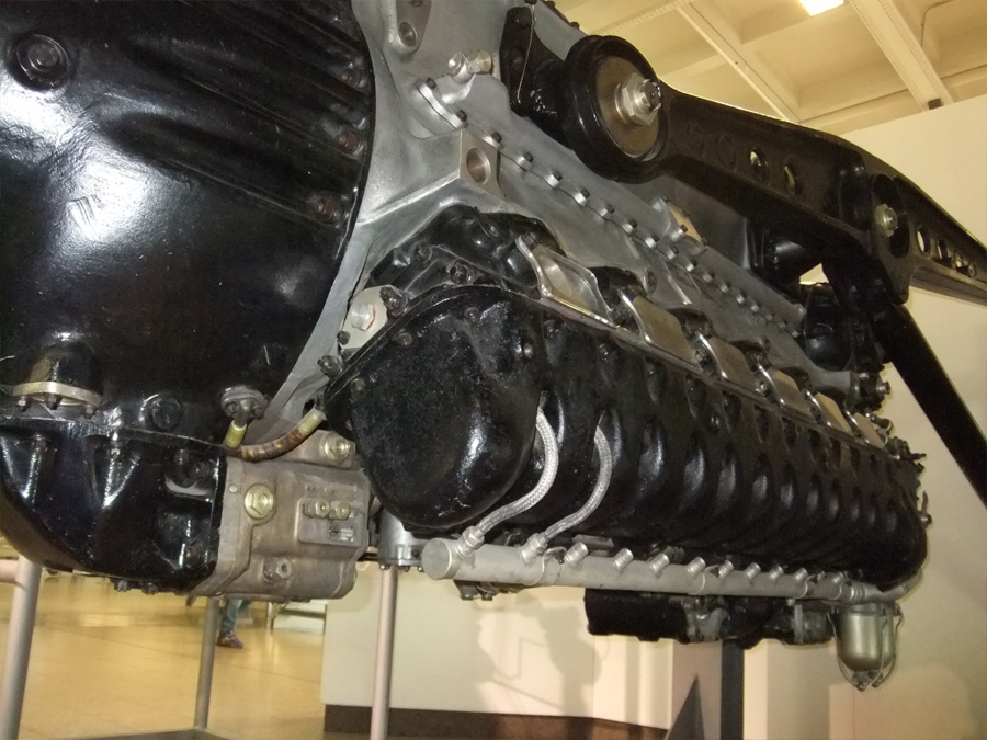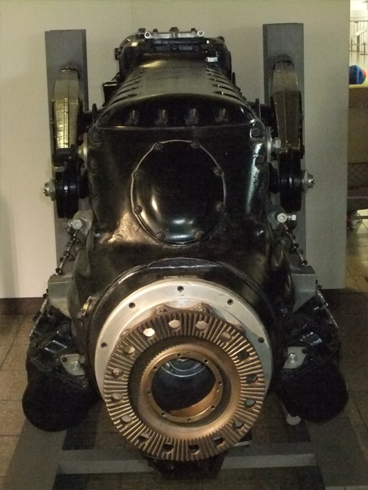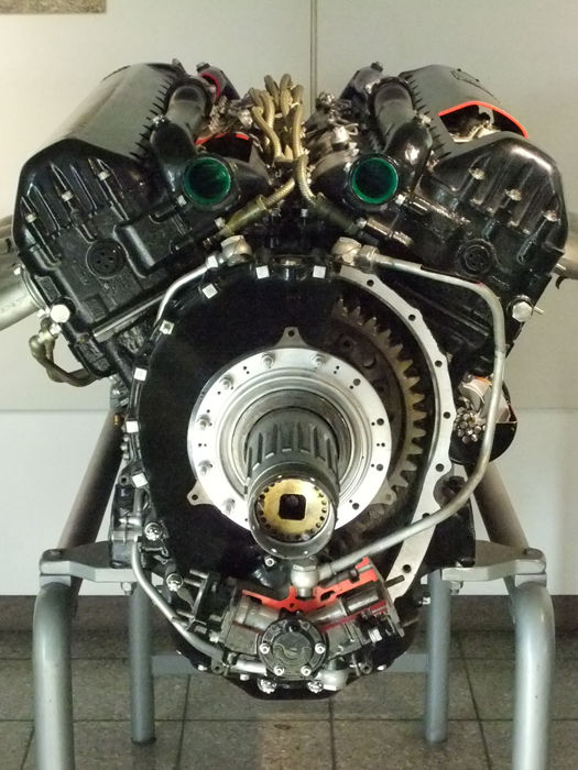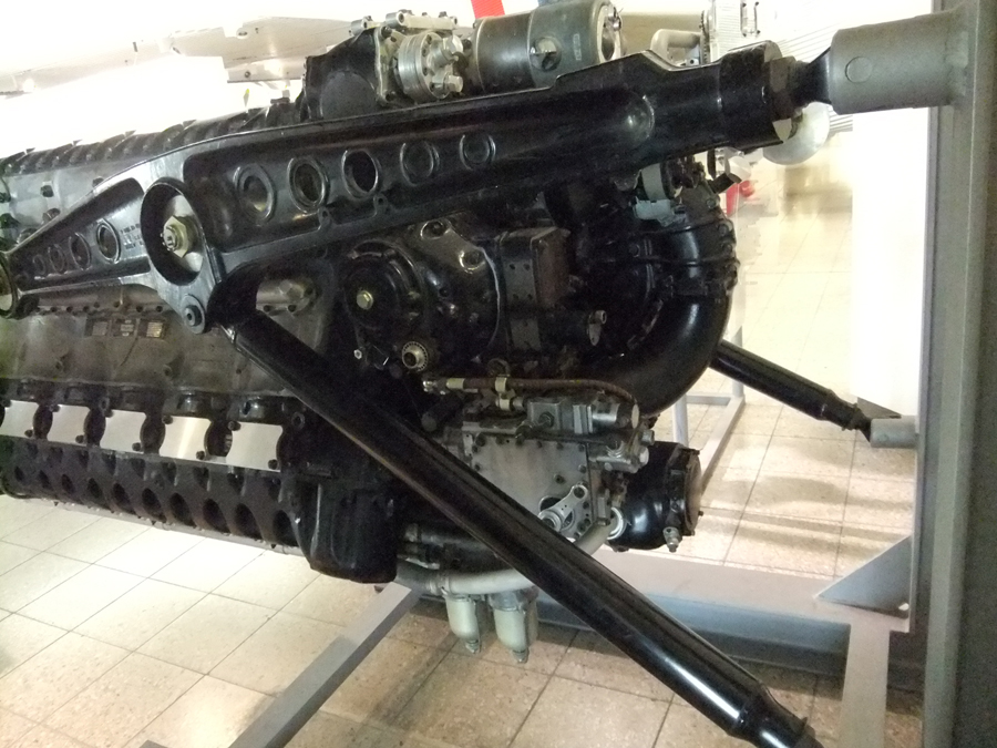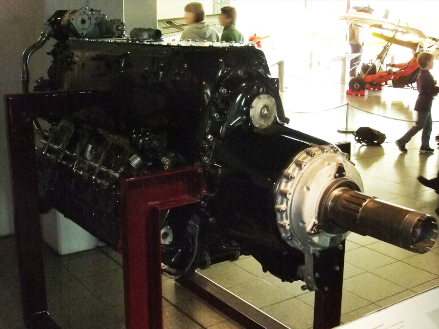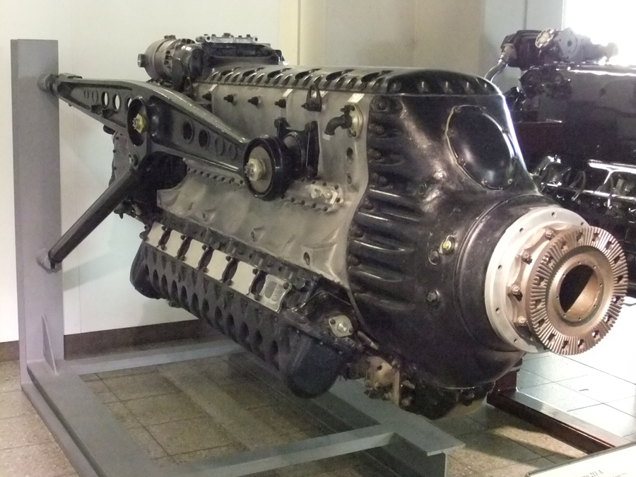 12-Zylinder Flugmotor. Der Flüssigkeitsgekühlte Motor arbeitet im Viertakt mit Einspritzpumpe.
