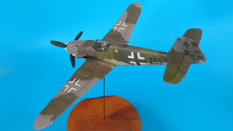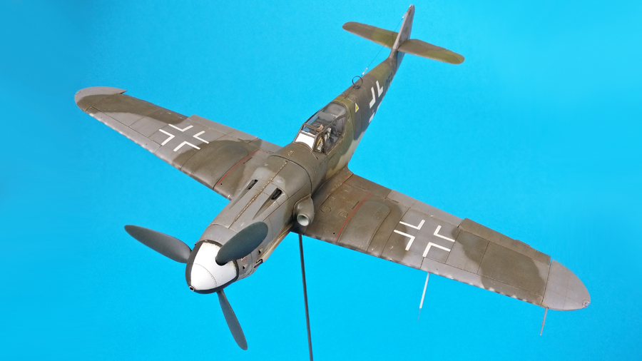 Baubericht | Bf 109 K-4 - Hasegawa-Modell ST20: ![]() Der einzige scharfe Einsatz dieses Sonderkommandos fand am 7. April 1945 statt. An diesem Tag ging auch die "334253" verloren. Das Wrack dieser Maschine wurde vor einiger Zeit geborgen und dient seit Jahren als Grundlage für die Rekonstruktion dieser 109 bei "Arsenal-45" (weitere Infos bei Verwendete Materialien: - eduard 32 121 "Bf 109 K-4 exterior" - eduard 32 122 "Bf 109 K-4 interior" - Master Model AM-32-062 "Bf 109 G5-G14, K armament & pitot tube" - RB Productions RB-P32028 "Bf 109 G-10/K-4 Radiators" - Quickboost QB 32 024 "Bf 109 G/K Exhausts" - A.M.U.R. Reaver RC3213 "Bf 109 G-10/K-4 supercharger intake" - A.M.U.R. Reaver RC3212 "Bf 109 K airscrew" ![]() Mit einem Nietenrad wurden vor dem Lackieren die Nietreihen nachgebildet. Die Farbgebung der "334253" wurde nach erhaltenen Farbresten auf den Blechen des Wracks und nach Tarnmustern ähnlicher Maschinen aus der Zeit rekonstruiert. Zum größten Teil entspringt es meiner Vorstellung von der Maschine. Sicher nachweisbar ist aber die Werknummer unten am Seitenruder, das mit RLM 75 und RLM 83 getarnt war und die schwarz aufgepinselte "253" am Hinterrumpf über einem Grund aus RLM 81 und der späten Variante von RLM 76 (die oft fälschlich auch als "RLM 84" bezeichnet wird). ![]() Wie es bei den bei Kriegsende dezentral hergestellten Maschinen oft zu sehen war, habe ich die einzelnen Baugruppen der K-4 mit verschiedenen Farbkombinationen gestaltet. Der Rumpf und die Höhenruder wurden in RLM 81/83/76(84) lackiert, die Motorgondel und die Tragflächen in RLM 75/83. Während die Unterseite der Motorgondel RLM 76 in der hellblauen Version ist, wurden die Unterseiten der Tragflächen in Naturmetall mit den späten, einfachen Kreuzen bemalt. Der Leitwerksträger ist K-4-typisch RLM 75/76 mit scharf abgegrenzten Flecken aus RLM 83 gestaltet. Da ich einen Parallel-Bau von zwei Bf 109 K-4 durchgeführt habe, wollte ich eine Maschine stehend und eine fliegend präsentieren. Im Flug zeigt sich die schlanke Linienführung dieses Flugzeuges besonders schön. Bilder der zweiten K-4 (als "schwarze 15") folgen auch bald. Viele Grüße! Dominikus |