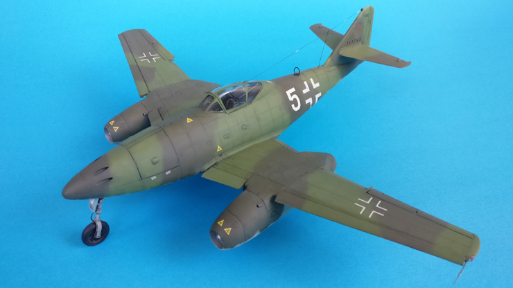 Messerschmitt Me 262 A-1a "Schwalbe" von: Dominikus Hausmann Werk-Nr. 111745 "Weisse 5", JV 44 München-Riem DE, /. April 1945 Scale 1/48 REVELL | No.04509 Geflogen von Eddi Schallmoser und anderen Piloten des Jagdverbandes 44, der wohl kurzlebigsten und kuriosesten Einheit der Luftwaffe bei Kriegsende. Verfeinert mit übrig gebliebenen Teilen des 262-Bausatzes von Tamiya, Leitwerks- und Landeklappen von CMK und eduard-Fotoätzteilen für das Cockpit. |